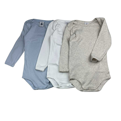 Lot de 3 bodies manches longues. Blanc, bleu ciel et beige chiné. Parfait état.